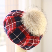 天天特价拼接格纹八角帽冬天青年女士保暖帽街拍帽超大貉子毛球帽