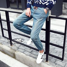 秋季男士薄款破洞小脚九分牛仔裤男修身款复古乞丐裤青年学生裤子