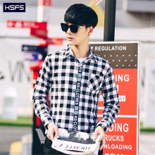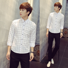 男士商务修身长袖白衬衫男青少年学生个性潮男韩版纯棉格子衬衣