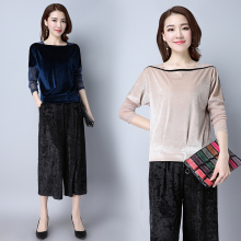 欧洲站春季新款时尚一字领宽松打底衫女金丝绒t恤女网纱长袖上衣