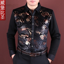 潮修身型烫金印花衬衫男冬季加绒加厚休闲长袖衬衣男 保暖衬衫男