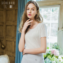 三彩2017夏装新品圆领木耳边修身针织白T恤短袖女上衣D721032Z20