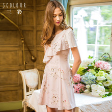 预售三彩2017春新品V领系带荷叶边碎花雪纺连衣裙女夏D712118L10