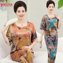 妈妈装夏装套装2017新款潮短袖雪纺印花T恤七分裤中老年两件套