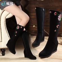 秋冬新款老北京布鞋女鞋坡跟高筒长靴女绣花鞋民族风防水台显瘦