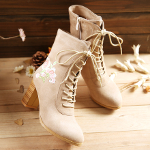 2017春秋冬新款马丁靴子绒面复古绣花靴高跟粗跟民族风短靴女系带