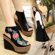 2017新款高跟民族风女鞋凉靴绣花鞋防水台鱼嘴鞋凉鞋女夏坡跟刺绣