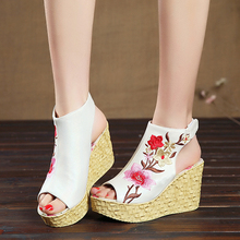 休闲度假民族风女鞋厚底坡跟凉鞋女夏2017真羊皮鱼嘴鞋绣花鞋高跟