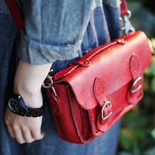 学院风红色牛皮邮差包单肩斜跨包英伦剑桥包手提小包复古真皮女包