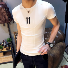 夏季韩版短袖男士修身T恤百搭学生圆领半袖数字贴布五分袖衣服潮