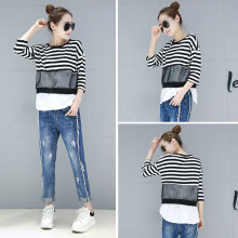 欧货2017春装新款女装T恤衫欧根纱拼接打底衫假两件宽松上衣女