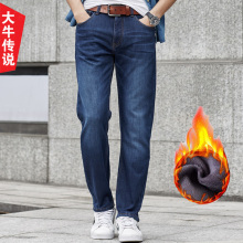 大牛传说加绒加厚宽松牛仔裤男直筒休闲加肥加大码弹力高腰长裤子