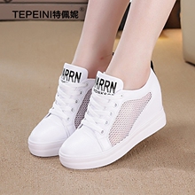特佩妮夏季运动休闲鞋内增高女鞋小白鞋网纱透气系带坡跟厚底单鞋
