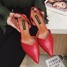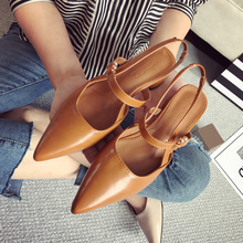 2017夏款新品尖头后跟绑带镂空优雅女鞋 舒适中跟粗跟气质凉鞋