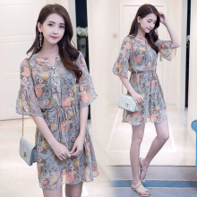 夏季2017新款韩版女装小清新收腰潮短袖雪纺碎花群主连衣裙中长款