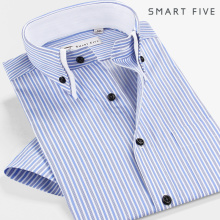 SmartFive 夏装蓝白条纹衬衫男短袖商务休闲双层领纯棉免烫衬衣男