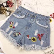 2017夏季新款小清新花朵刺绣流苏毛边破洞短款裤子牛仔短裤热裤女