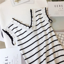 17新款韩版chic木耳边V领条纹无袖针织背心女外穿学生打底衫上衣