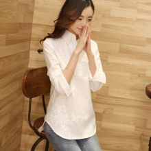 2017春装新款棉麻白衬衫韩版大码女装中长款显瘦韩范刺绣白色衬衣