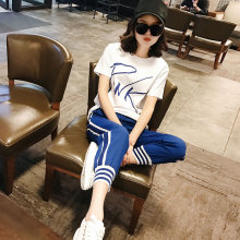 欧洲站夏季套装女时尚两件套2017新款短袖韩版T恤运动条纹九分裤