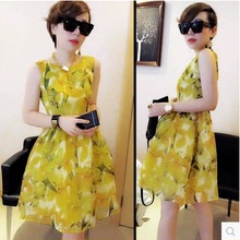 欧洲站2017夏装新款女装欧根纱连衣裙大码显瘦时尚印花无袖蓬蓬裙