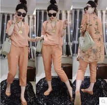 欧洲站2017春装欧货潮印花外套休闲棉麻九分裤显瘦麻料三件套装女