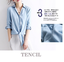 清爽宜人浅牛仔蓝色 腰部可系带设计翻袖天丝绵衬衣
