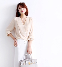 风琴褶细节 简洁V领设计松紧木耳袖雪纺衬衣