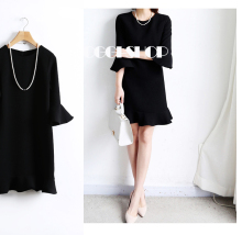 春 17 经典小黑裙 荷叶袖设计华夫格面料春款修身连身裙