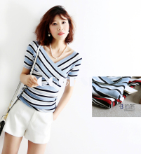 美锁骨提升颜值 撞色条纹交叉裹胸型弹力针织衫 上装 17春夏女