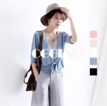 搭配推荐 舒适随意含真丝 短款系飘带设计V领针织开衫 17春夏女