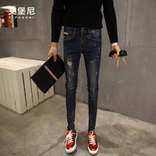 艾堡尼 春季韩版时尚水洗磨破牛仔裤男破洞修身小脚裤男潮P