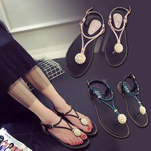 2017夏季平跟女鞋珍珠夹趾凉鞋女粗跟夹脚学生百搭罗马沙滩鞋女潮