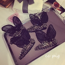 林志玲明星同款黑色蕾丝兔耳朵蝴蝶结韩国水钻发夹边夹刘海夹BB夹