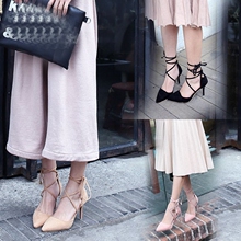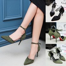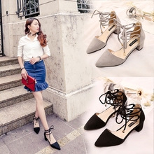 2017春秋新款浅口绒面丝带单鞋细跟绑带尖头高跟鞋欧美性感女鞋子