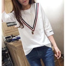 宽松中袖T桖女拼色彩条V字图案上衣袖口字母打底衫欧洲站2017夏装
