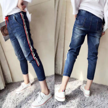 牛仔裤女九分薄款欧洲站潮款小脚哈伦裤拼彩条松紧腰垮裤大码女裤