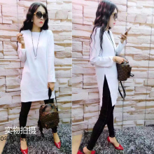 中长款白色T恤2017春装新款 百搭宽松下摆开衩纯棉长袖打底衫上衣