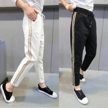 新款百搭显瘦白边运动休闲裤女春秋高腰长裤宽松黑色哈伦裤小脚裤
