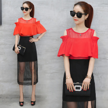 2017夏装新款韩版时尚套装女漏肩雪纺衫短裙网纱名媛连衣裙两件套