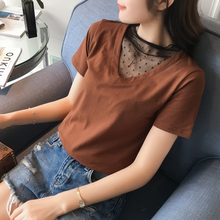 2017夏季新款韩版百搭网纱拼接v领上衣女蕾丝打底衫纯棉短袖t恤女
