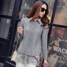 诗慕莎秋冬新款韩范气质宽松中长款纯色圆领下摆蕾丝针织衫毛衣裙