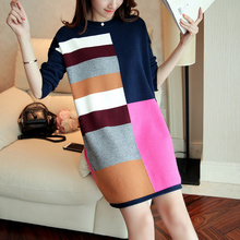 诗慕莎2016韩版新款时尚中长款圆领拼色套头针织衫女装打底毛衣潮