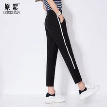 2017新薄款夏装九分裤白条拼接宽松大码胖mm黑色小脚哈伦休闲裤