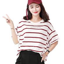 2017夏新款红色条纹T恤女青春宽松透气棉体恤圆领五分袖上衣