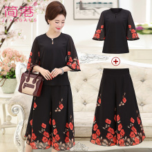 40-50岁妈妈装夏装套装短袖雪纺T恤衫中老年人女装上衣裤子两件套
