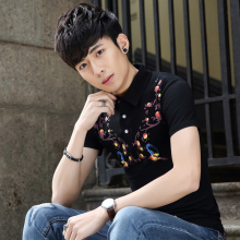 夏季男短袖t恤韩版潮日系印花翻领青少年修身纯棉半袖夏天衣服 潮