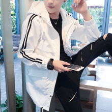 ONE77 2016秋装新款双杠条纹休闲风衣男韩版中长款时尚连帽外套潮