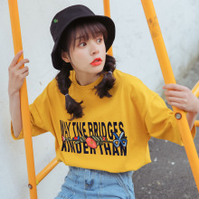 纯棉短袖t恤女夏黄色宽松韩版学生纯色bf风百搭个性中袖体恤衫