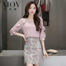 艾欧唯女套装连衣裙2017夏装新款荷叶袖潮雪纺上衣一步裙两件套